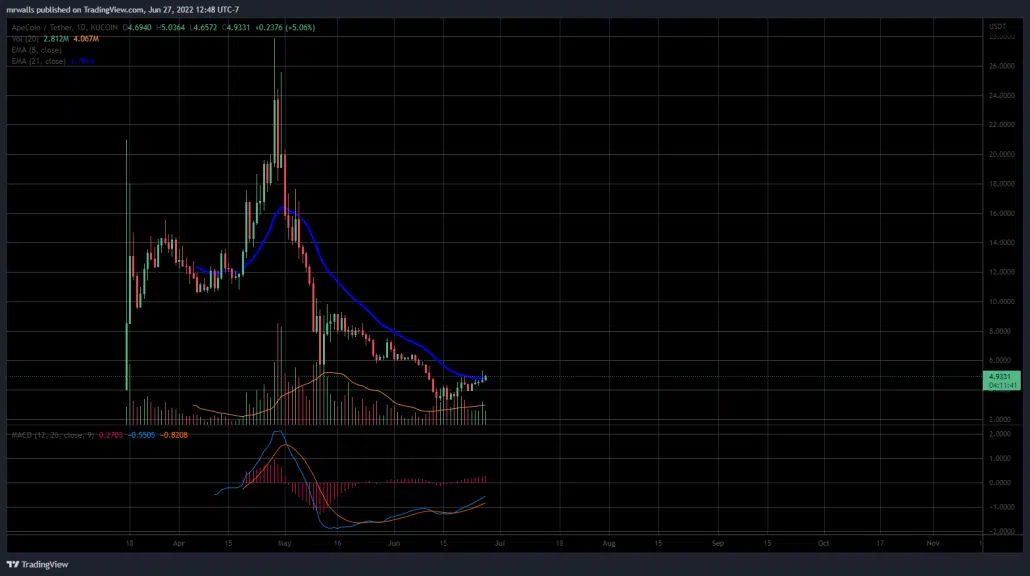 Solo a fines de abril, el precio de ApeCoin alcanzó un máximo histórico de casi $ 27 en anticipación de las ventas de NFT de tierras virtuales para el juego de metaverso de BAYC, Otherside. Los titulares pueden utilizar ApeCoin para votar las propuestas de gobernanza de ApeCoin DAO.