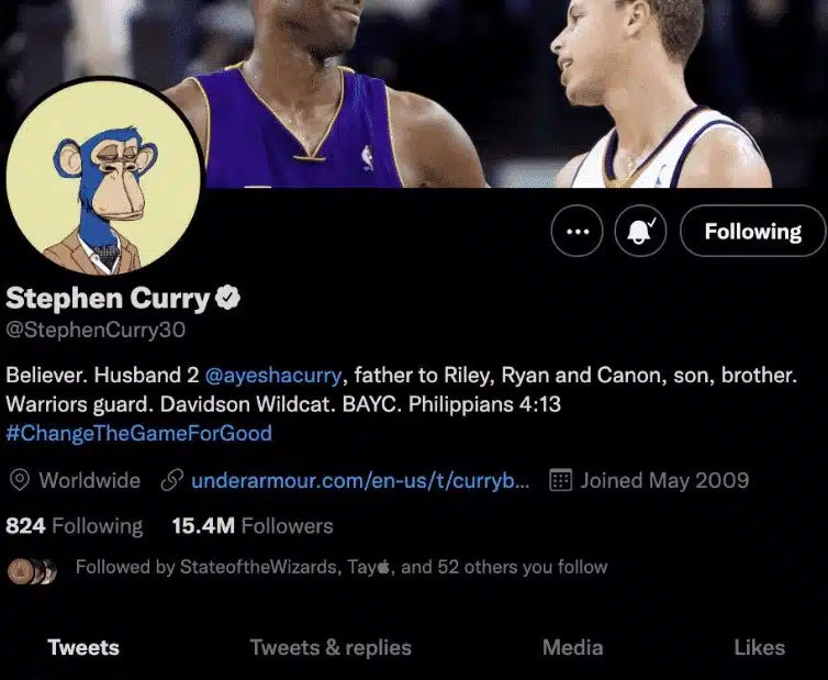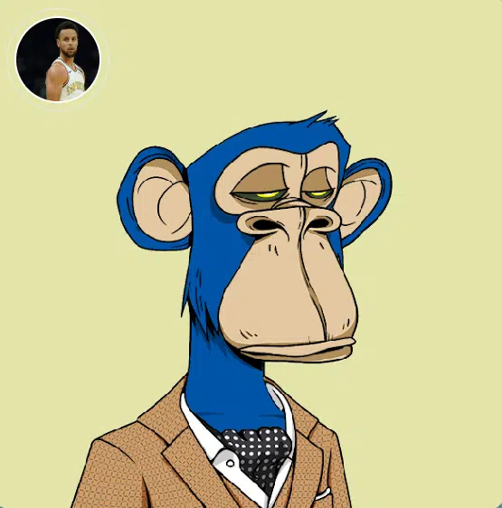 La estrella de la NBA de los Golden State Warriors, Stephen Curry, se ha metido en el Bored Ape Yacht Club con Ape #7990. Compró su Ape por 55 ETH. Los rasgos notables incluyen pelaje azul, ojos de zombi y un traje de tweed. Curry actualmente usa su Bored Ape como su foto de perfil de Twitter.