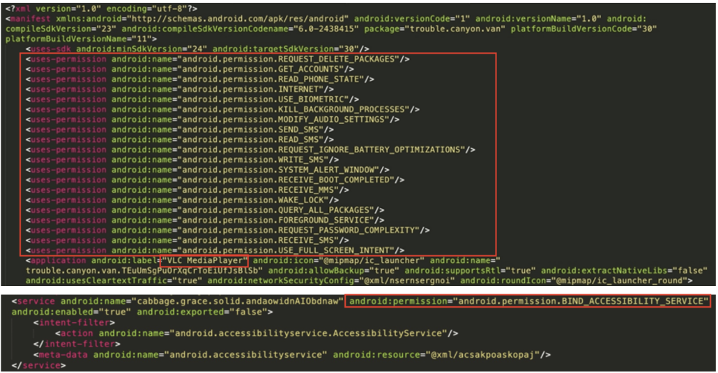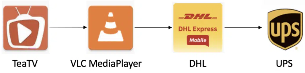 Inicialmente, el nombre de la aplicación usado por la app maliciosa era “TeaTV”; sin embargo, durante el último mes el nombre de la app se cambió a “VLC MediaPlayer”, “Mobdro”, “DHL”, “UPS” y “bpost”, el mismo cebo usado por el famoso malware bancario Flubot/Cabassous.