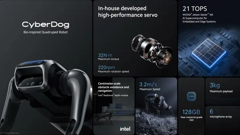 El cerebro de CyberDog se alimenta de la plataforma NVIDIA Jetson Xavier NX, un superordenador de IA para sistemas integrados y de borde que incluye 384 núcleos CUDA, 48 núcleos tensoriales, una CPU ARM de 6 Carmel y 2 motores de aceleración de aprendizaje profundo. Para sus propietarios, CyberDog procesa sin problemas los datos masivos captados por su sistema de sensores.